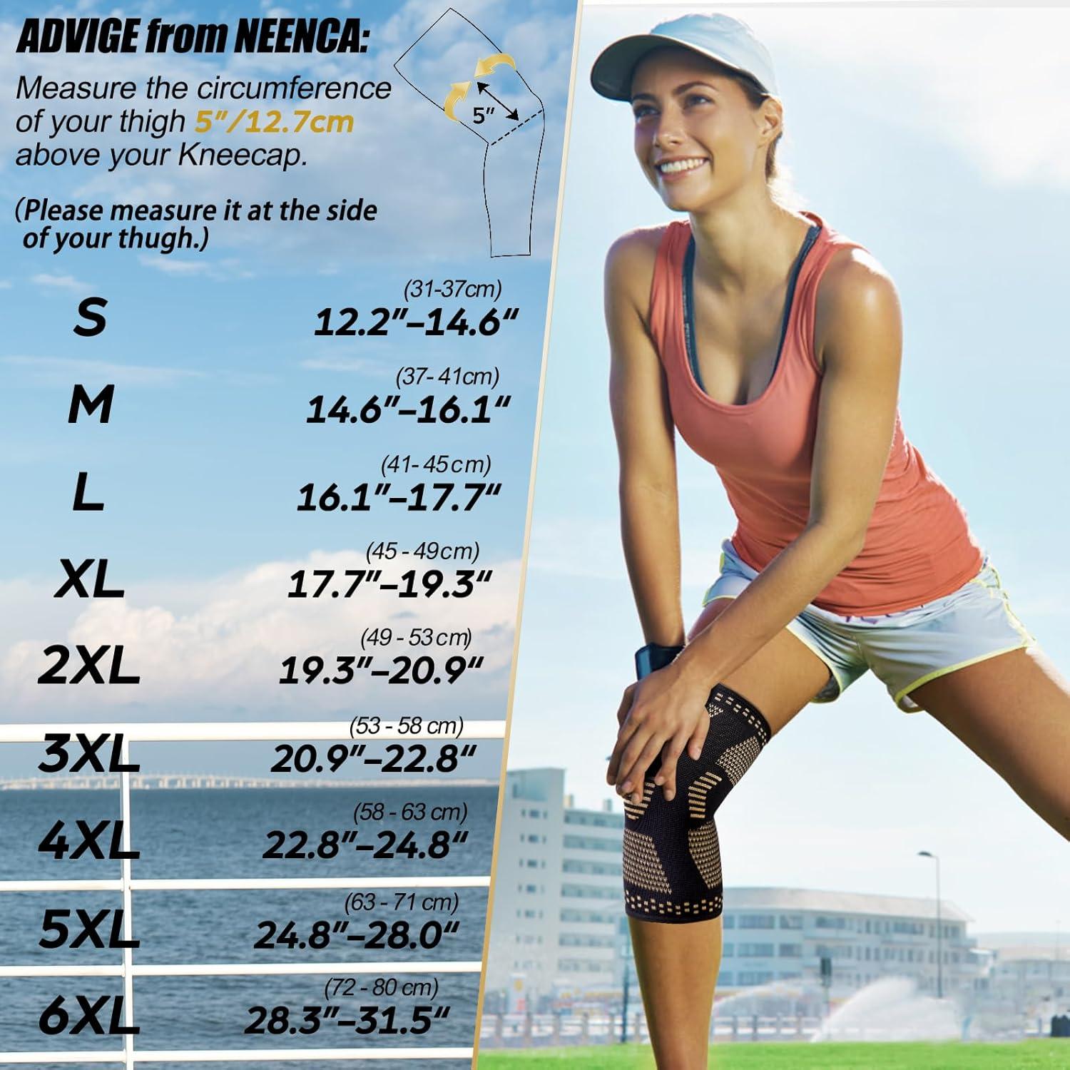 TRUSTED BRAND & MULTIFUNCTION— NEENCA is a professional outdoor supplies manufacturer, Professional knee sleeves for meniscus tear, arthritis, ACL, joint pain relief, sports injury recovery. Widely used in many sports such as weightlifting, basketball, running, jogging, volleyball, CrossFit, gym, tennis, hiking and more! Universal for men and women, suitable for both left and right thighs. Please refer to the size chart for selection.