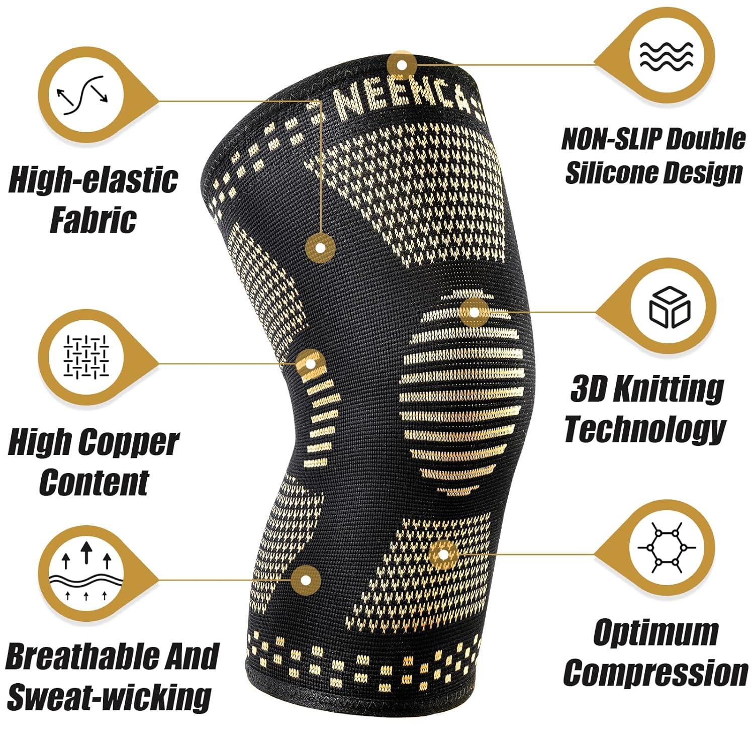 NEENCA Copper Ions Infused Technology— Real 24% Copper Ions Infused Fiber + 21% Nylon +16% Polyester. 3D structure of woven, High-precision cutting technology of knitting. With high-elastic tight and breathable compression fabric to 360° perfectly fit your kneecap curve. It will strengthen side support and maintains joint stability, effectively disperses pressure, keeping your knee warm, lubricating your joints. BEST CHOICE for sports protection and pain recovery.