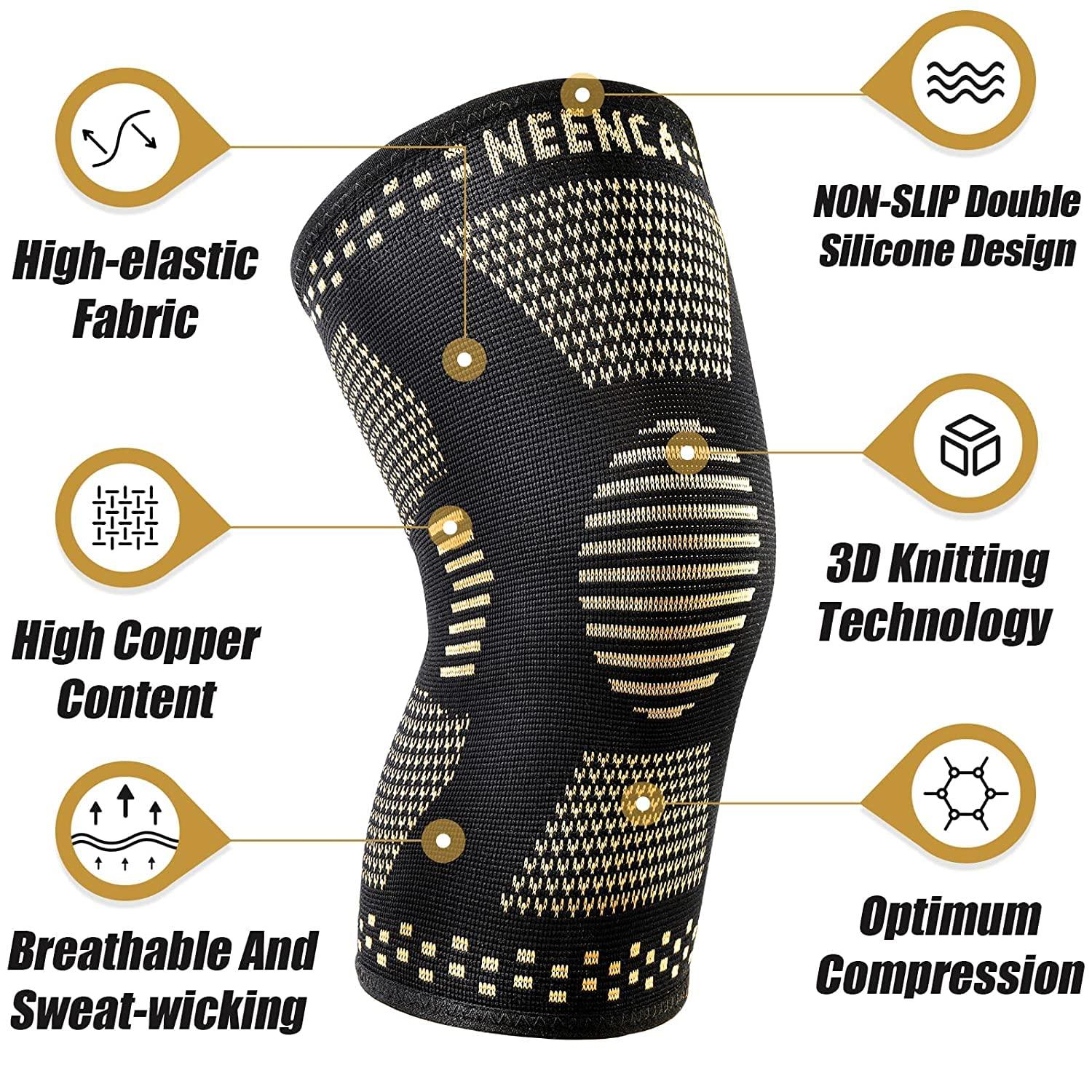 NEENCA Copper Ions Infused Technology— Real 24% Copper Ions Infused Fiber + 21% Nylon +16% Polyester. 3D structure of woven, High-precision cutting technology of knitting. With high-elastic tight and breathable compression fabric to 360° perfectly fit your kneecap curve. It will strengthen side support and maintains joint stability, effectively disperses pressure, keeping your knee warm, lubricating your joints. BEST CHOICE for sports protection and pain recovery.